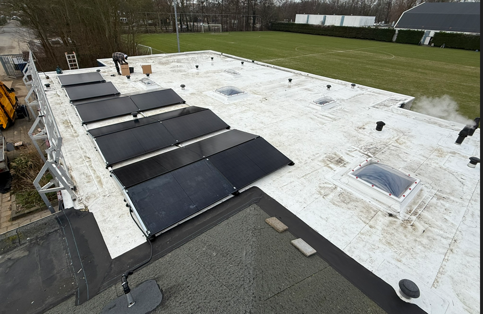 Stappen we over van blauw naar groen?? Nee, geen paniek. Maar qua energie worden we steeds groener. De afgelopen week is gestart met de aanleg van zonnepanelen op de kleedkamers. Hiermee gebruiken we duurzamere energie en besparen we uiteraard op de kosten. I.c.m. de led-verlichting op onze velden maken we mooie stappen!